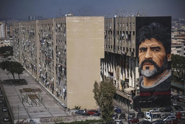 Οι δρόμοι και τα κτίρια της Νάπολης, εδώ και σαράντα χρόνια, είναι γεμάτοι με γκράφιτι όπως αυτό (δια χειρός του Τζόριτ Άγκοτς), για να τιμήσουν την τεράστια προσφορά του Ντιέγκο Αρμάντο Μαραντόνα στην ομάδα, στην πόλη και τον φτωχό ιταλικό Νότο. Ο θάνατος του Πίμπε ντε Όρο, τον περασμένο Νοέμβριο, δεν έκανε τίποτε άλλο από το να γεμίσει με ακόμα περισσότερους βωμούς λατρείας (κάθε είδους) την επίγεια κατοικία του «Ανθρώπινου Θεού» (όπως αναγράφεται στο σχετικό γκράφιτι) για τους Ναπολιτάνους.