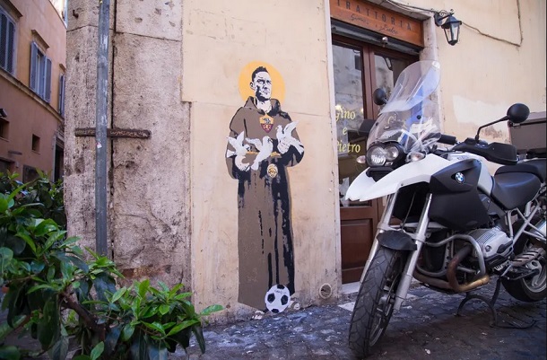 Αυτό ακριβώς είναι για τους φίλους της Ρόμα ο αιώνιος αρχηγός τους. Ο Άγιος Φραντσέσκο Τότι, ο οποίος απαρνήθηκε τα εκατομμύρια και την δόξα της Μίλαν και της Ρεάλ Μαδρίτης για να παραμείνει για πάντα Ρωμαίος και να μην φορέσει άλλη φανέλα πέραν αυτής της ομάδας που αγαπάει από μικρό παιδί. Η Αιώνια Πόλη είναι γεμάτη από παρόμοια γκράφιτι, έστω και αν πολλά, δυστυχώς, δεν γλιτώνουν από την... περιποίηση των οπαδών της Λάτσιο.