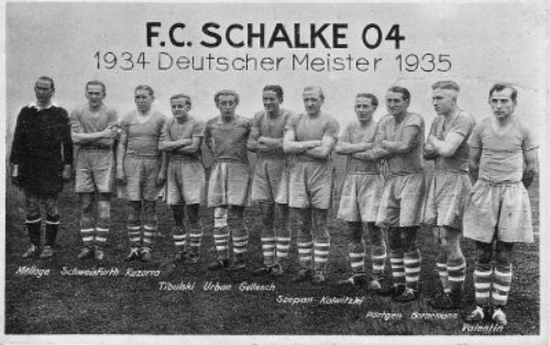 Το 1934 έρχεται το πρώτο πρωτάθλημα με τη νίκη επί της Νυρεμβέργης με 2-1 με χρυσούς σκόρερ τους Κούζορα και Σζέπαν. Εκτός από αυτούς τους δύο σε αυτή την ομάδα υπήρχαν αρκετοί άλλοι που το επίθετό τους φανέρωνε τον τόπο καταγωγής τους. Βαλεντίν Πρζιμπίλσκι, Ερνστ Καλβίτζκι, Ότε Τιμπούλσκι, Φέρντιναντ Ζάγιονς και Άλα Ούρμπαν είχαν πολωνική καταγωγή, ενώ άλλοι έχοντας την δυνατότητα «γερμανικοποίησαν» το επίθετό τους. Έτσι, ο αριστερός χαφ της ομάδας Εμιλ Τσζερβίνσκι έγινε Εμίλ Ρότχαρντ, ενώ ο Ζουράβσκι έγινε Ζούρνερ, ο Ρεγκέλσι Ρέκμαν, και Ο Ζεμπρίνσκι Ζίντλερ . Ο τίτλος αυτός έδωσε την ευκαιρία στην αθλητική πολωνική εφημερίδα Przegląd Sportowy κυκλοφόρησαν με τίτλους όπως... «Ο γερμανικός τίτλος είναι στα χέρια της Πολωνίας» και... «Ο θρίαμβος των συμπατριωτών μας» με αναφορά στο γεγονός πως οι περισσότεροι ποδοσφαιριστές της πρωταθλήτριας Γερμανίας ήταν πολωνικής καταγωγής. Μάλιστα, το γεγονός της καταγωγής της πλειοψηφίας των παικτών της Σάλκε προκάλεσε την χλεύη της υπόλοιπης Γερμανίας η οποία κόλλησε στους «βασιλικούς μπλε» το υποτιμητικό για εκείνη την εποχή παρατσούκλι Polackenverein (Πολωνικός σύλλογος).