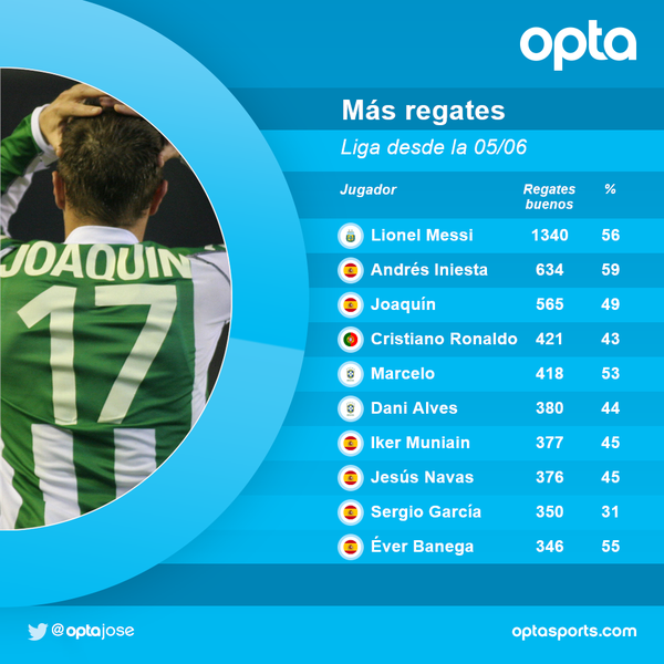 Για να καταλάβει κανείς πόσο αποτελεσματικός ήταν στο να αποφεύγει τους αντιπάλους, τις τελευταίες δέκα σεζόν, παρότι έλειψε τη διετία 2011-2013, είναι ο τρίτος σε επιτυχημένες ντρίμπλες στην Primera Division με 565. Ο Χοακίν ποσοστό 49% και από πάνω του βρίσκονται μόνο οι Λιονέλ Μέσι με 1.340 (56%) και Αντρές Ινιέστα με 634 (59%). Κάτω από τον Ισπανό βρίσκεται ο Κριστιάνο Ρονάλντο με 421 (43%).