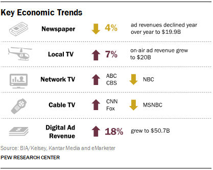 Όταν λοιπόν ανεβάζεις π.χ. εκατό θέματα την ημέρα και τα δέκα που διαβάζονται αφορούν αποκλειστικά τις γυμνές φωτογραφίες της μίας celebrity ή το διαζύγιο του τάδε ηθοποιού και όλες οι υπόλοιπες ρεπορταζιακές ειδήσεις βυθίζονται, προφανώς κάποια στιγμή, ως Μέσο, πρέπει να κάνεις μια επιλογή. Ειδικά, αν συνυπολογίσουμε και το διαφημιστικό πεδίο της εποχής που είναι σε πολύ άσχημη κατάσταση: Ή ακολουθείς το ρεύμα και διαμορφώνεις το προϊόν σου ή πηγαίνεις κόντρα και μακροπρόθεσμα (ή ίσως και βραχυπρόθεσμα) πληρώνεις τις συνέπειες. Είναι χαρακτηριστικό πώς τα έσοδα των εφημερίδων στις ΗΠΑ από διαφημίσεις το 2004 έφτανε τα 22 δισεκατομμύρια δολάρια και μόλις οκτώ χρόνια μετά, το 2012, αυτό το νούμερο έπεσε στα 4 δισεκατομμύρια! (πηγή: Pew Research Center)