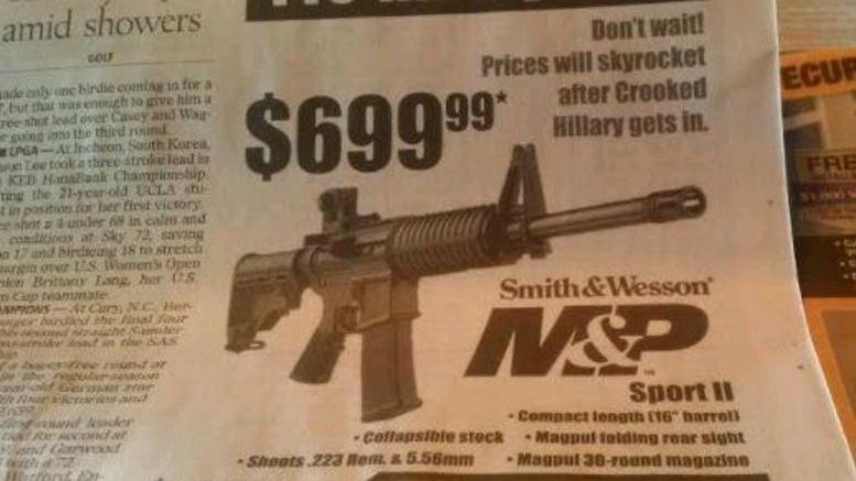 «Πριν έρθει η διεφθαρμένη Χίλαρι Κλίντον, αγόρασε όπλο τώρα σε χαμηλές τιμές» αναφέρει η διαφήμιση γνωστής αμερικανικής εταιρείας όπλων στην εφημερίδα και προσθέτει «Με 699 δολάρια πωλείται το πολεμικό αυτόματο που εμφανίζεται στη διαφήμιση "Μην περιμένετε! Οι τιμές θα εκτοξευτούν αφότου έρθει η απατεώνας Χίλαρι». «Ουσιαστικά θέλει να καταργήσει την 2η Τροπολογία. Και, αν μπορέσει να διαλέξει τους δικαστές της, δεν μπορέσετε να κάνετε τίποτα, φίλοι μου. Ίσως όμως, ακριβώς λόγω της 2ης Τροπολογίας, να μπορείτε να κάνετε. Δεν ξέρω», είχε τονίσει ο Τραμπ... Στον αντίποδα, η Χίλαρι Κλίντον μάχεται για την κατάργηση της 2ης τροπολογίας και υπόσχεται να κάνει τα πάντα και να κερδίσει, κάτι που δε συνέβη με κανέναν άλλο Πρόεδρο. Ωστόσο, κανείς δεν ξεχνά το e-mail, που δόθηκε από το Wikileaks, όταν η υπουργός Κλίντον τάσσεται υπέρ της χρήσης βίας στη Συρία για την ανατροπή της κυβέρνησης.